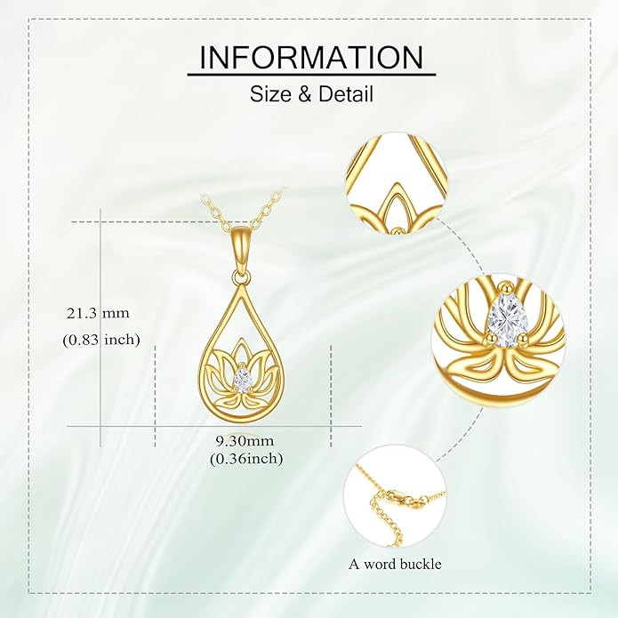 • ?Lotus pendant size:0.83*0.36 inches ,Yellow Gold Chain length: 16"+2" adjustable extender ,Packaging :1 x 14K gold necklace and 1 x exquisite gift box.