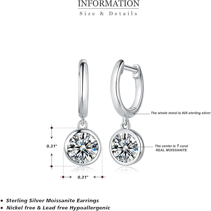925 Sterling Silver Moissanite Earrings, 0.5ct-1ct Moissanite Halo Earrings for Women, Moissanite Drop Dangle Hoop Earrings, Round Cut Brilliant D Color VVS1 Clarity Moissanite Stud Earrings for Women