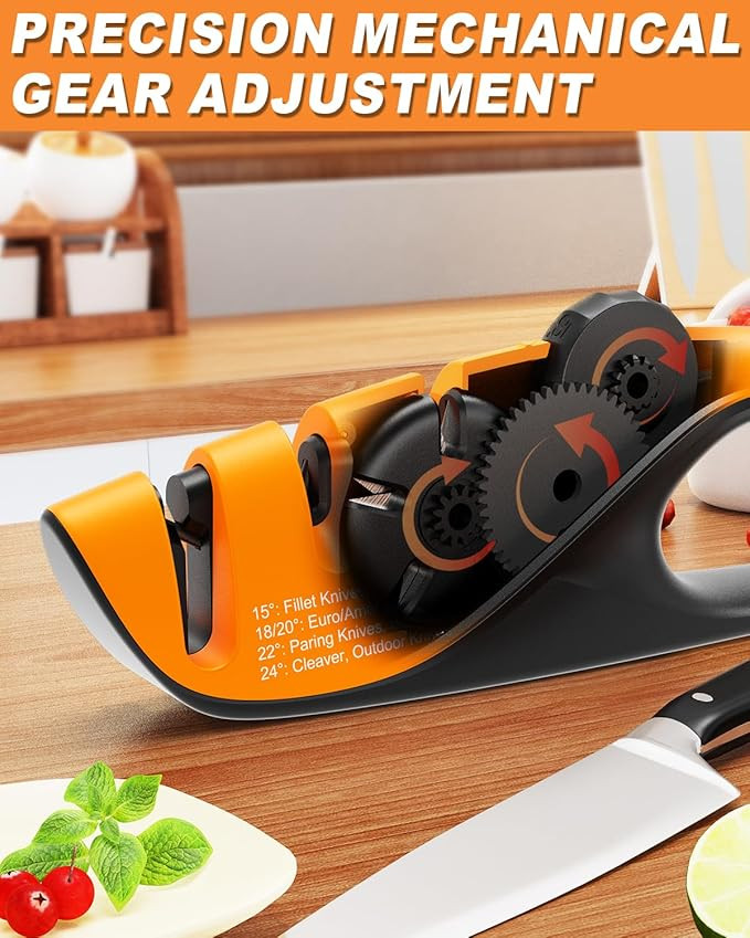 【5 Sharpening Angles】Adjustable knife sharpeners for kitchen knives has 5 adjustable angles (15/18/20/22/24°), suitable for most household kitchen knives including serrated knives, coarsely ground tungsten steel and finely ground ceramic rods and scissor rods can quickly restore the sharpness of the knives, and the 5 sharpening slots are independently designed, which will effectively extend the service life of the knife sharpener kit.