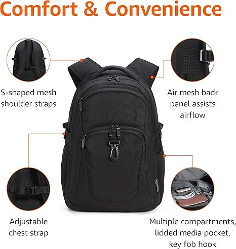 • Breathable air mesh panel at the back and deep air channels create maximum airflow between your and the pack. It has padded s-shaped mesh and padded shoulder straps for shoulder comfort; a chest strap with an adjustable buckle ensures the backpack fits you snug; and a foam padded top handle for a long time carry on.