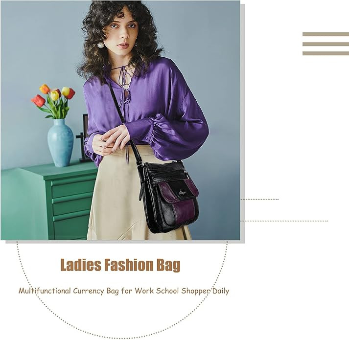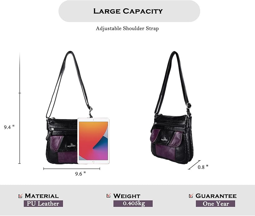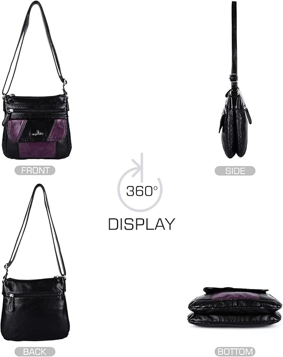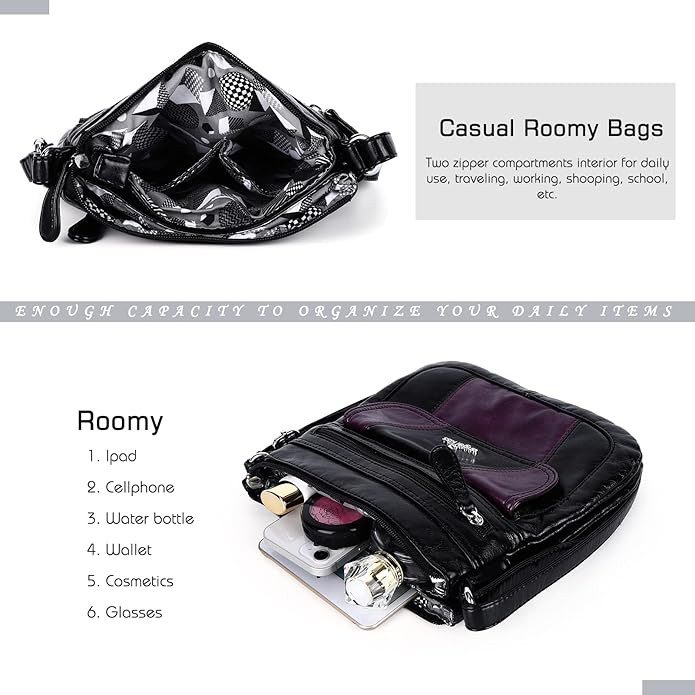 • PU Leather Handbag Structure- Ladies shoulder Crossbody handbag has 2 large compartment can comfortably accommodate various items like cellphone, wallet, a few cosmetics but not intended for large amounts of items. This crossbody purses has 1 back zipper pocket, 1 inner zipper pocket, 2 slot pockets for some tiny items such as coins, pens, napkin. You would never get crazy when looking for tiny essentials in this handbag.