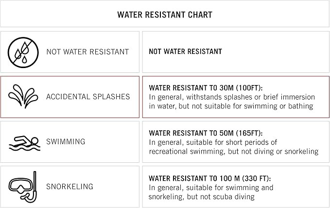 • Water resistant to 30 meters (99 feet): In general, withstands splashes or brief immersion in water, but not suitable for swimming or bathing