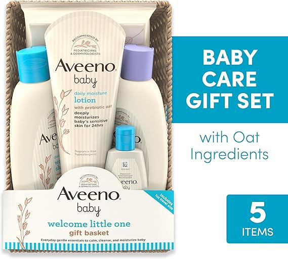 Aveeno Baby Welcome Little One Gift Basket, Baby Skincare Set with Nourishing Baby Body Wash & Shampoo, Calming Bath Wash, All Over Baby Wipes, & Daily Moisturizing Lotion, 5 Items