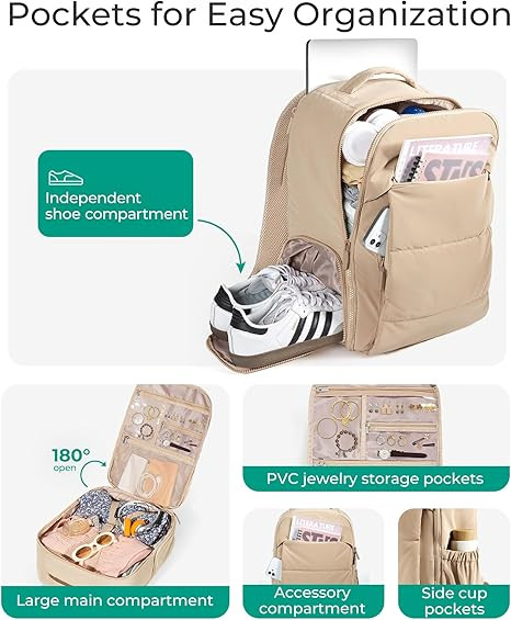 • Practical Features: A separate shoe compartment on the side maintains cleanliness and organization. The Padded 15.6" laptop compartment towards the backside, keeps electronics easy to access and provides reliable protection against impacts. Additionally, the back strap conveniently fits over a suitcase handle for effortless transport