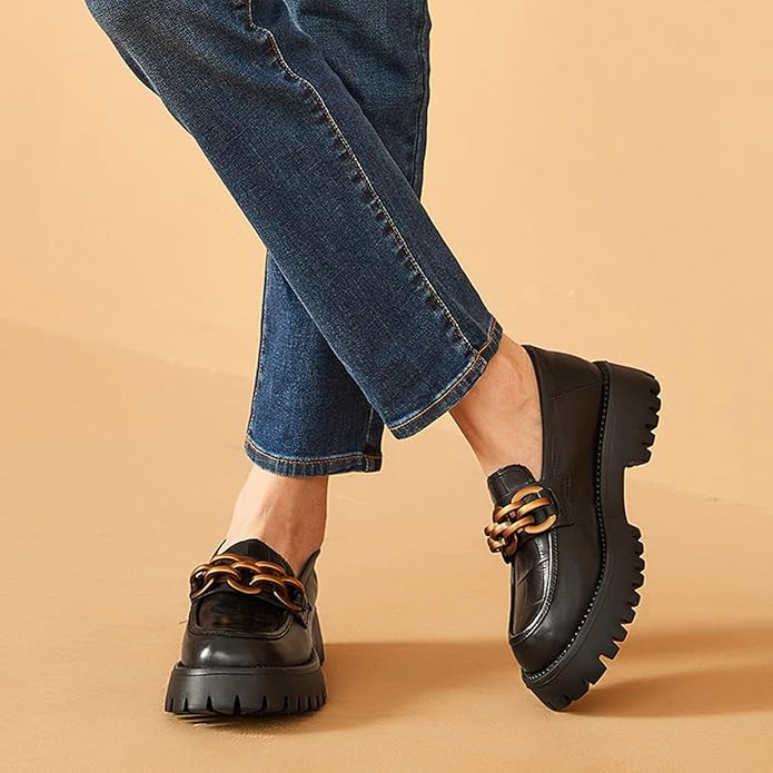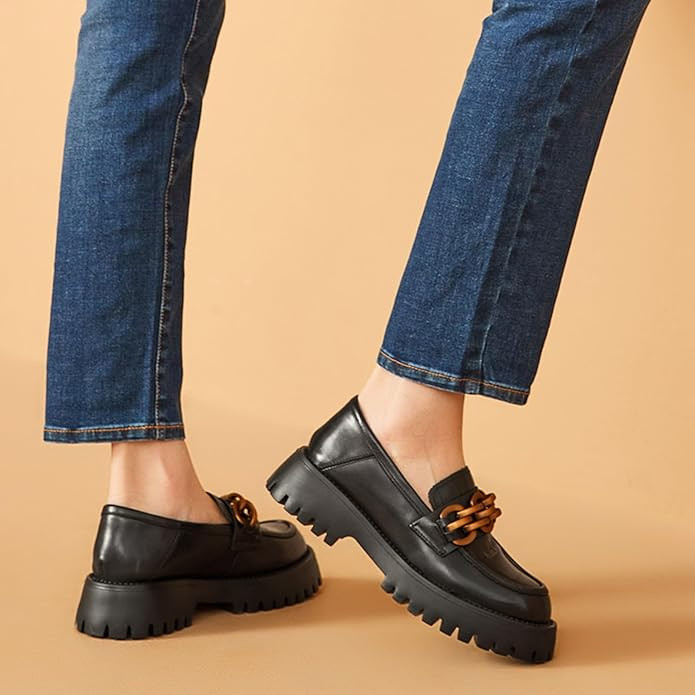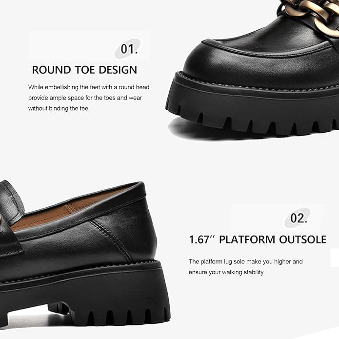 • Retro Chunky Lug Sole:Platform chain loafers for women featured a resilient and abrasion resistant foam rubber sole,making it soft and comfortable to wear,the retro lug sole design can play a good role in anti-slip