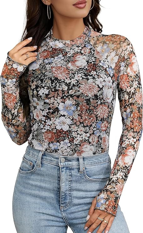 Buauty Lace Mesh Long Sleeve Tops Mock Neck Floral Going Out Tops for Women Trendy Double Lined Outfits Date Night Outfits