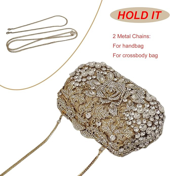 • ■Multifunctional bag.■ This bling clutch comes with two detachable metal chains of different lengths for you to use. The short one is used for evening clutches, handbags, with beautiful evening wear. The longer one is for shoulder or crossbody bag for easy portability, but also for everyday use. Also comes with some spare crystals. Packed in a black velvet bag in a gift box. (Just about standard for gift wrapping, so you don't have to actually pay for additional packaging)