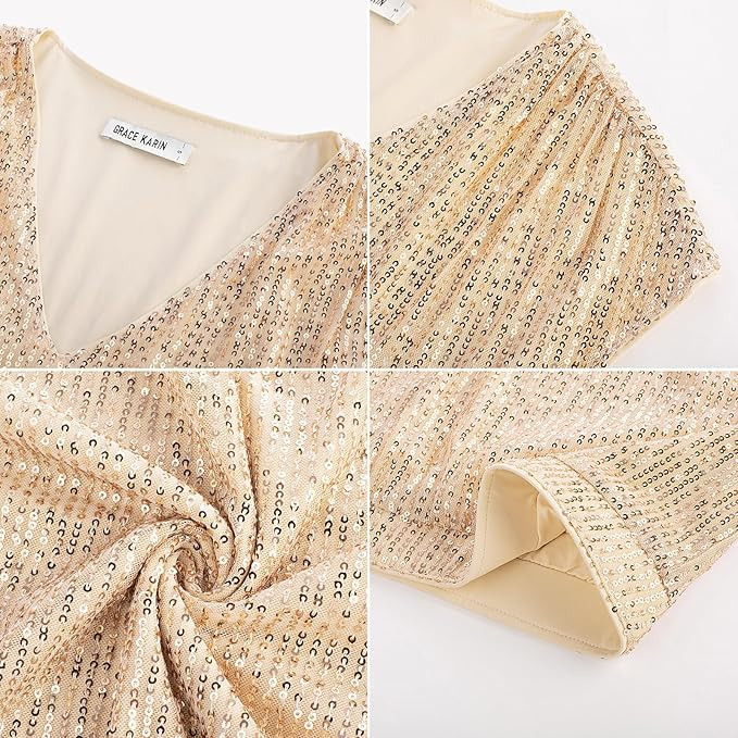 GRACE KARIN V Neck Sequin Short Sleeve Tops for Women Elastic Sparkly Tank Top for Party