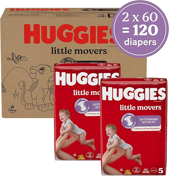 • Huggies Size 5 Diapers: 120 Little Movers Baby Diapers (2 packs of 60), size 5 (27+ lbs); packaging may vary