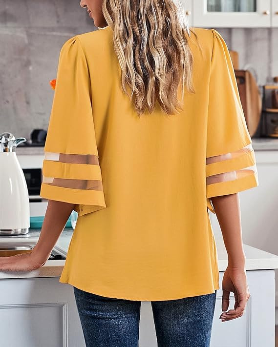 LookbookStore Women's V Neck Mesh Panel Blouse 3/4 Bell Sleeve Loose Top Shirt