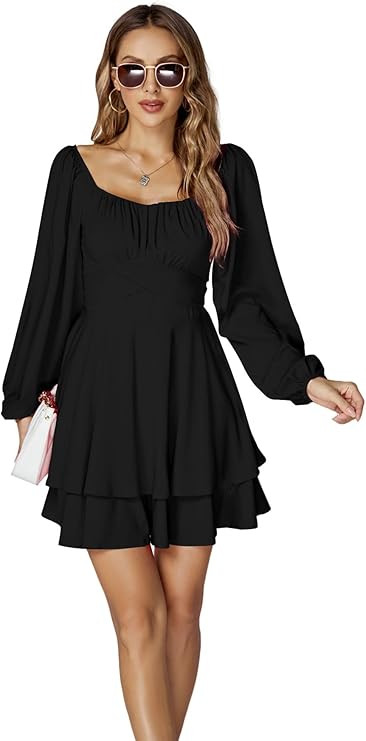 • Square neck, baggy long sleeves with elastic cuff, empire waist, wrap front, tie up bow knot back, sweet and lovely. Long sleeve ruffle mini dress with A-line silhouette, cover the tummy well and show your legs slimmer and longer, visually to have a charming shape.