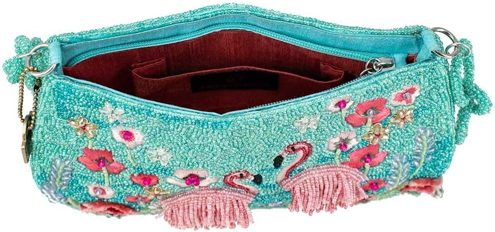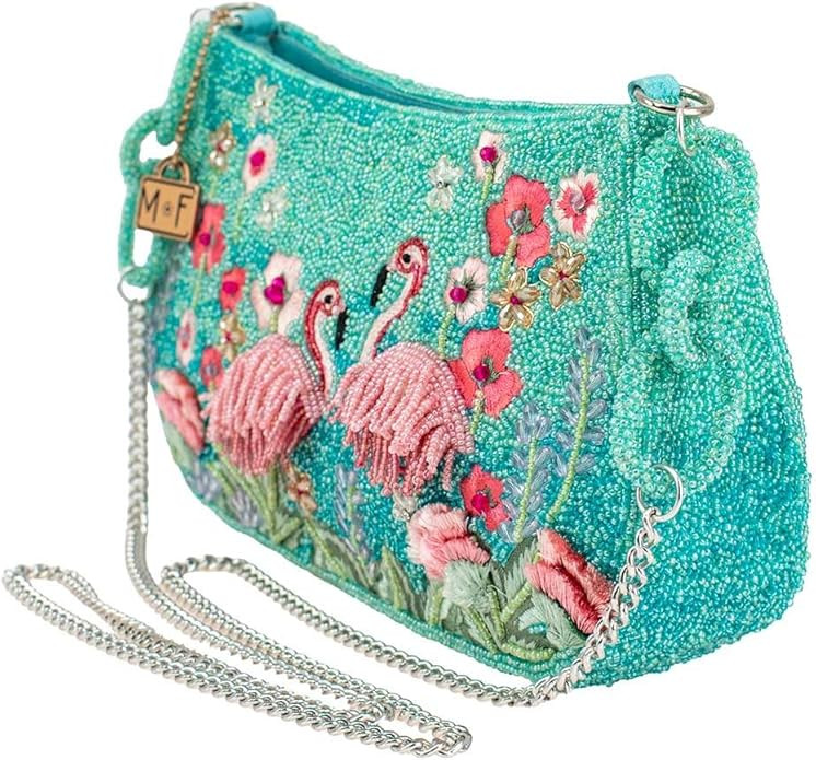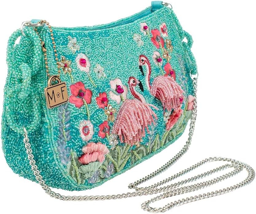 • Tropical Paradise Design: The Mary Frances Flirty Flamingos Beaded Crossbody Handbag invites you to step into a tropical paradise with flamboyant flamingos. Shimmering turquoise beadwork meets a flock of playful pink surrounded by a flourish of embroidered flowers, creating a vibrant and eye-catching design.