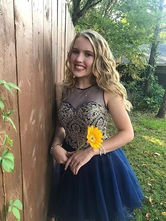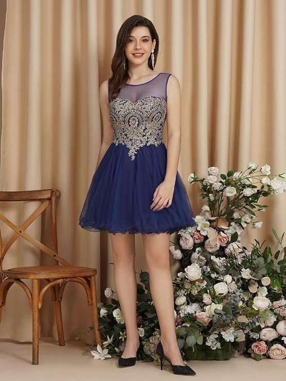 • Junior's Homecoming Dresses Rhinestones Gold Applique Short Prom Dresses for Teens