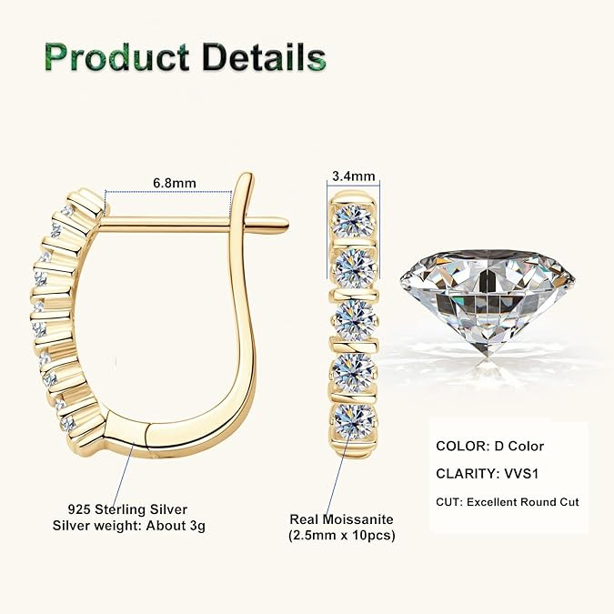 • CLASSIC STYLE HOOP EARRINGS: The moissanite hoop earrings fit for every women, any occasion such as daily wearing, party, home, office and travel etc. It also fits for daily wearing home and office. We use hand made setting instead of wax setting, to ensure our stones are stronger and safer, make it look more beautiful and high-end outlook.
