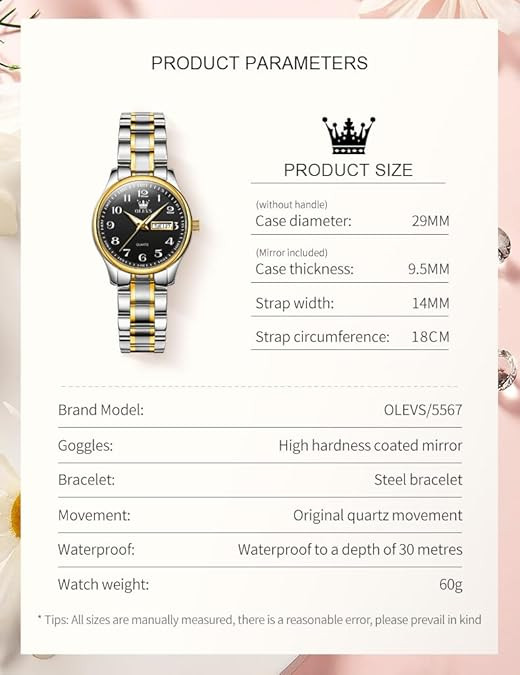 • ?【Lady Watch】Lady Wristwatch Come with OLEVS Brand Gifts Set Box.We provide with Free Adjust Tool,watch strap can be easily adjusted and dismantled.Luxury Gifts for women,Can be used for Mother's Day,Christmas,Halloween,Anniversary.