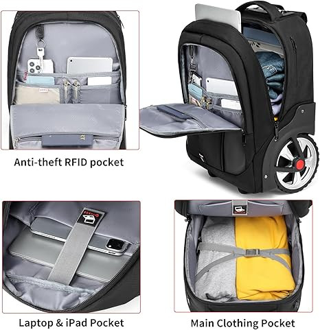 [Large Capacity Space] Large rolling backpack size is 21 x 14.1 x 10.2 inches(53.5*36*25cm).The Padded laptop compartment with Velcro sleeve -16 x 10.2 x 1.2 Inches holds up to 17 inch laptop, as well as 15 Inch 14 Inch and 13 Inch laptop. Large main compartment roomy have 50L, hold books, clothes, documents and folders. And other multi-pocket organizer with key fob provide more storage for smaller items, ideal gift laptop rolling backpack, wheeled laptop backpack
