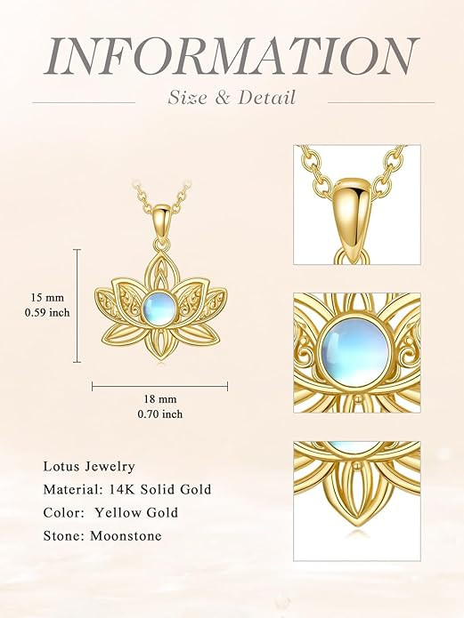 Solid 14K Gold Lotus Flower Necklace, Lotus Pendant with Moonstone Necklaces, Alcoholics Anonymous Sobriety Lotus Yoga Spiritual Jewelry for Women Birthday Christmas Gift for Her Mom Wife, 16+2 Inch