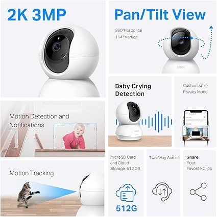 【2K High Definition】Capture every detail inside your home with crystal-clear 2K high definition video with this indoor security camera. Easily see what your baby is holding or what your pet is playing with.Controller Type:Amazon Alexa;Android;Google Assistant.Connectivity protocol:Wi-Fi.Power source type:Corded Electric, Power Adapter: 100–240 V