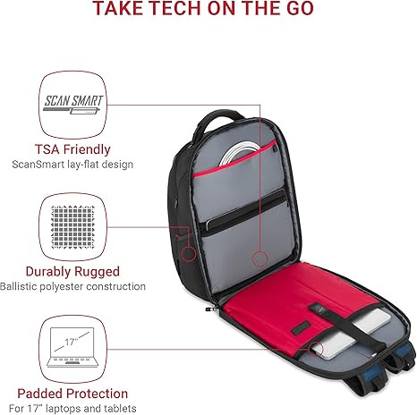 • 17-Inch Laptop Backpack: This marriage of contemporary design and innovative storage features a padded, TSA-friendly SmartScan tech compartment for 17” laptops and 11” tablets that lays flat through airport security and an array of organizer pockets that keep your essential accessories and more within reach