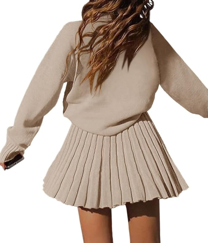 Women's 2 Piece Outfits Turtleneck Long Sleeve Oversized Pullover Sweaters and Pleated Mini Skirt Two Piece Sets
