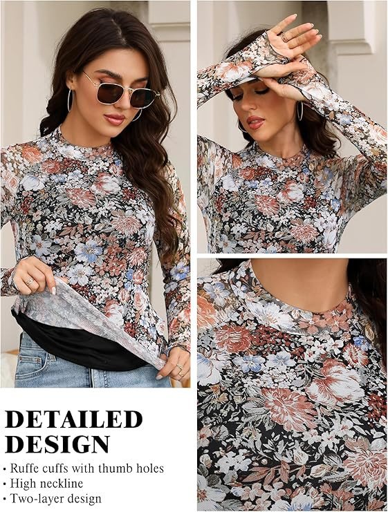 Buauty Lace Mesh Long Sleeve Tops Mock Neck Floral Going Out Tops for Women Trendy Double Lined Outfits Date Night Outfits