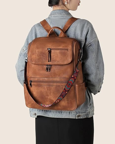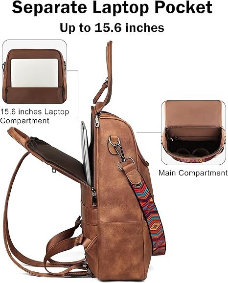 • Size & High Quality Materials: 12.7"W*5"D*16"H, 1.85 lb. This women's leather laptop backpack is made of the latest waterproof PU vegan leather, soft and retro, quality hardware, smooth zipper without sticking, and reinforced design at the connection between the shoulder strap and backpack, making the leather backpack more durable. So this is a sturdy and stylish laptop backpack.