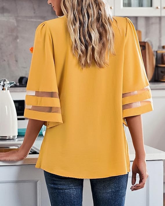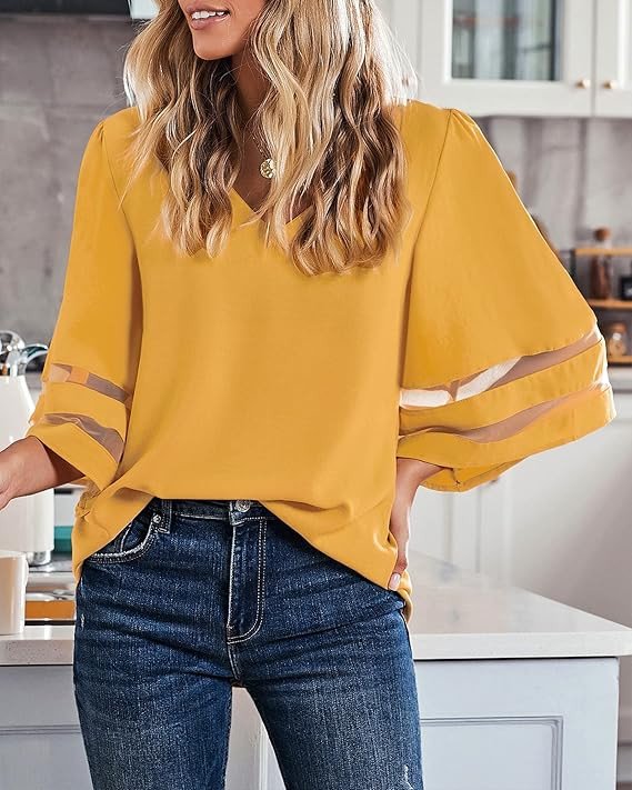 LookbookStore Women's V Neck Mesh Panel Blouse 3/4 Bell Sleeve Loose Top Shirt