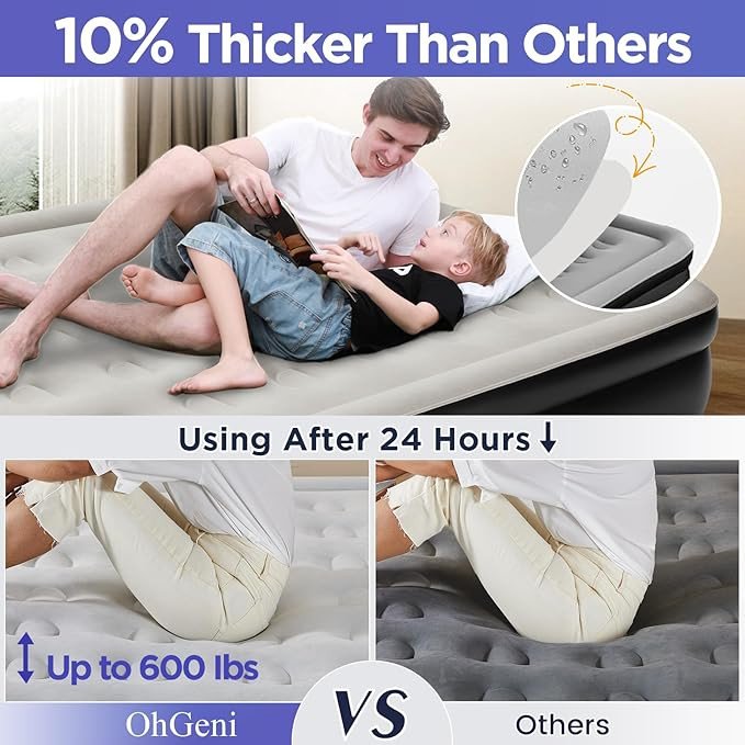 Unrivaled Comfort: Experience unmatched comfort on the OhGeni air mattress/colchon iinflatable, a meticulously designed 18" deep queen size inflatable bed (80"L x 60"W x 18"H) with a built-in 110V electric air pump for quick and effortless full-body support. The air coil support system provides even and secure weight distribution from head to toe, ensuring maximum relaxation for adults and durability for the whole family