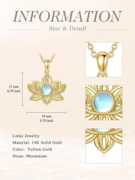 ?Size: Lotus Pendant: 15x18mm(0.59''x0.70''); 16+1+1 inch gold Rolo chain Adjustable. Gemstone: Moonstone. Total Gold Weight: 1.82g.