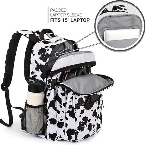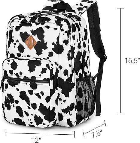 ZORFIN 26L Backpack for School, College, and Travel: Water Resistant Bookbag with 8 Compartments - Cow Print Black
